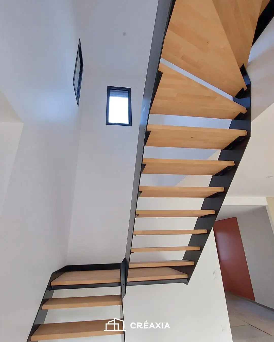 Structure en acier noir, marches en hêtre massif, contremarches ouvertes qui laissent passer la lumière. Deux fenêtres verticales, décalées en hauteur, éclairent naturellement la cage d’escalier sans créer de vis-à-vis avec l’extérieur. En montant les marches, la lumière suit c’est un effet recherché, pas accidentel.