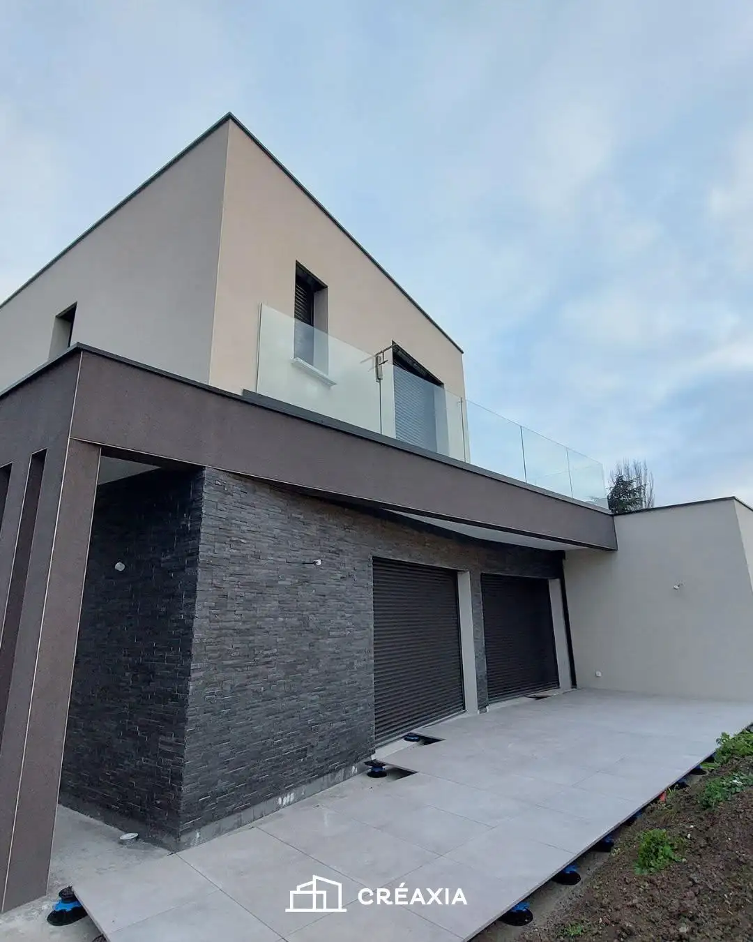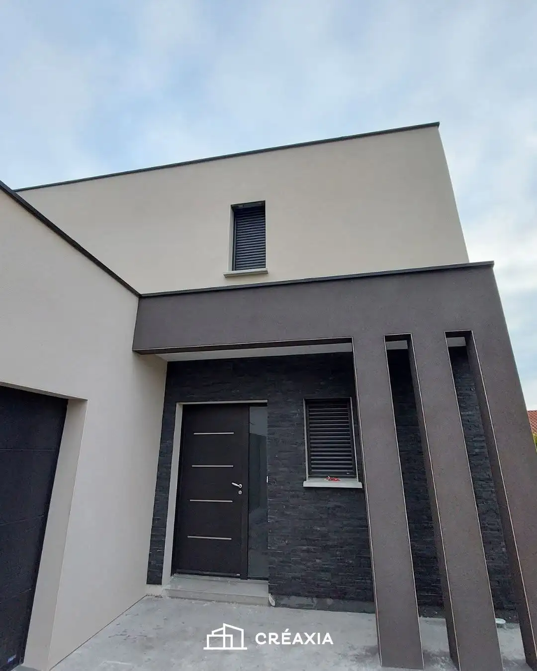 Trois matières se superposent : l’enduit sable clair en partie haute, l’enduit anthracite foncé qui structure et alourdit visuellement le soubassement, et le parement ardoise noire qui habille toute la zone d’entrée et de garage. Chacune a un rôle précis dans la composition. Le résultat tient parce que l’exécution est propre : calepinage de la pierre soigné, raccords d’enduits nets, arêtes franches. Ce sont des détails qui ne sautent pas aux yeux sur une photo, mais qui font qu’une façade vieillit bien ou mal.