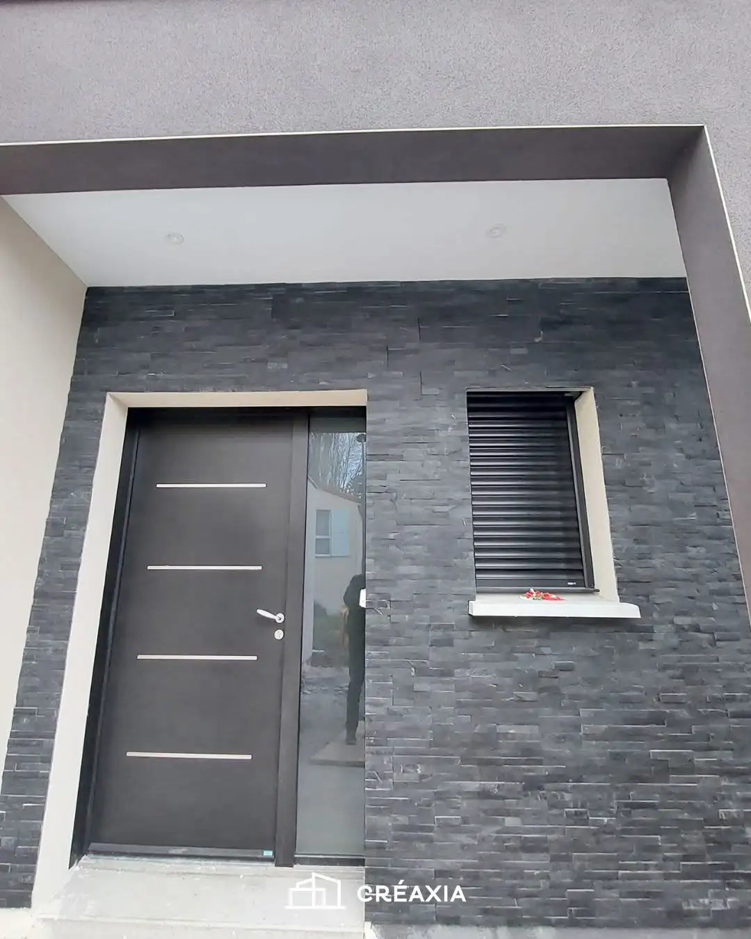 Porte d’entrée anthracite avec imposte vitrée latérale, enchâssée dans un habillage intégral en ardoise, sous un porche avec spot encastré au plafond. Cette entrée ne se contente pas d’être fonctionnelle elle annonce clairement ce qu’est la maison avant même qu’on y pénètre.